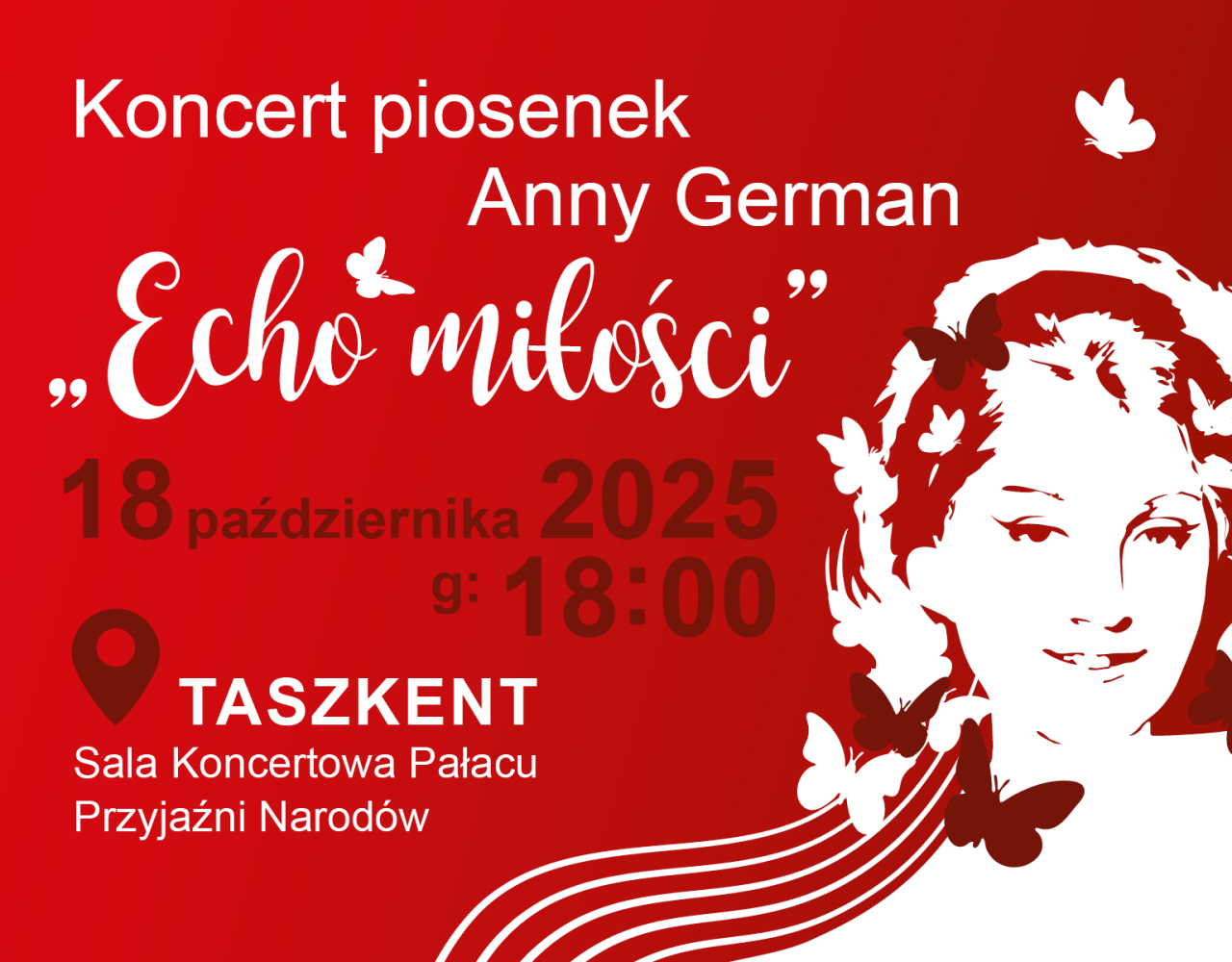 KONCERT piosenek Anny German „Echo miłości” w Uzbekistanie Koncert piosenek Anny German „Echo miłości”Data: 18 października 2025 r. o godz. 18:00Miejsce: Pałac „Przyjaźni Narodów” w Taszkencie […]- Date